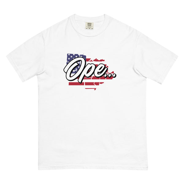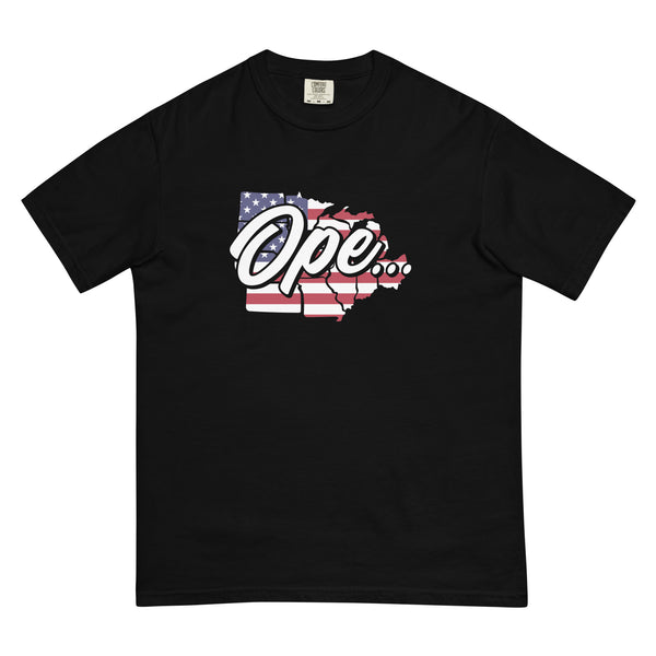 Wear your Midwestern charm proudly with our "Ope" t-shirt, featuring a backdrop of the American flag, symbolizing the friendly and approachable nature of the region, fused with a patriotic spirit that resonates with the heartland of America.