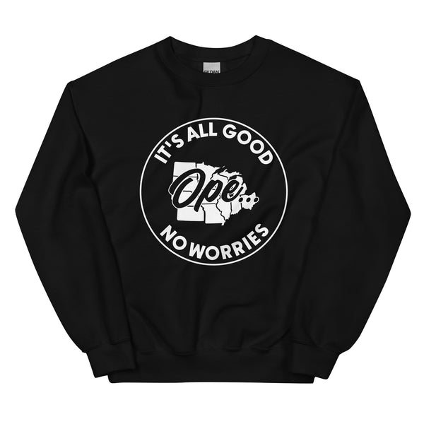 "Ope, It's All Good, No Worries" crewneck, the perfect blend of comfort, style and Midwest, designed to spread positivity and embrace a carefree attitude.